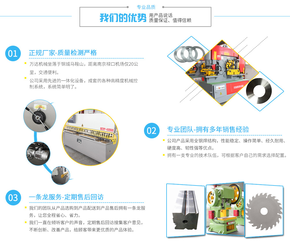 馬鞍山萬達機械科技有限公司是在新形勢下投資新建的高新技術(shù)企業(yè),成立于2013年,專業(yè)生產(chǎn)銷售各類折彎機,剪板機、卷板機、沖壓機、鱷魚式剪切機,金屬液壓打包機,液壓聯(lián)合沖剪機,數(shù)控刀模具等。經(jīng)營過程中采取先進管理模式,引進先進的技術(shù),在產(chǎn)品質(zhì)量上不斷向更高層次邁進。在人力資源開發(fā)中,堅持“以人為本”的管理理念,專業(yè)為航空、輕工、冶金、化工、建筑、汽車、電力、裝潢等行業(yè)提供所需要的專用機械和成套設(shè)備。 本公司經(jīng)營主導(dǎo)產(chǎn)品有:液壓折彎機、剪板機、卷板機、沖床,鱷魚式剪切機,金屬液壓打包機;剪板機刀片、折彎機模具、圓刀片、攪拌機合金耐磨等機械成套設(shè)備和配件。對于客戶特殊要求的非標(biāo)準(zhǔn)產(chǎn)品,也是我們技術(shù)開發(fā)計劃中深化改革的一項重大舉措。讓每一個客戶滿意,才能真正實現(xiàn)國際化,集團化的營銷市場。通過經(jīng)營過程中不斷追求...榮譽資質(zhì)